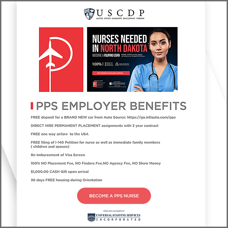 PPS was incorporated in North Carolina in 2006 for the primary purpose of recruiting Filipino Allied Healthcare Professionals. Their current focus has transitioned to the recruitment of nursing professionals for Direct Hire US employer placements. UNISTAFF and PPS have been working together since its inception, and together, we have helped thousands secure their dream jobs.